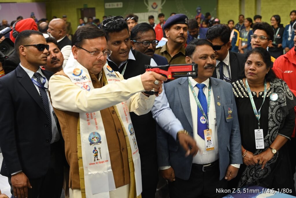 इस दौरान मुख्यमंत्री ने अधिकारियों को निर्देश दिए कि कार्यक्रम के दौरान किसी भी प्रकार की कोई भी समस्या न हो इस हेतु सभी व्यवस्थाएं चाक चौबंद हो। इस अवसर पर मुख्यमंत्री श्री धामी ने फैनसिंग के प्रथम, द्वितीय एवं तृतीय प्रतिभागियों से परिचय प्राप्त कर उन्हें मेडल प्रदान कर सम्मानित किया गया। उन्होंने निशानेबाजी प्रतिभागियों का मनोबल बढाते हुये उत्साहवर्धन किया।