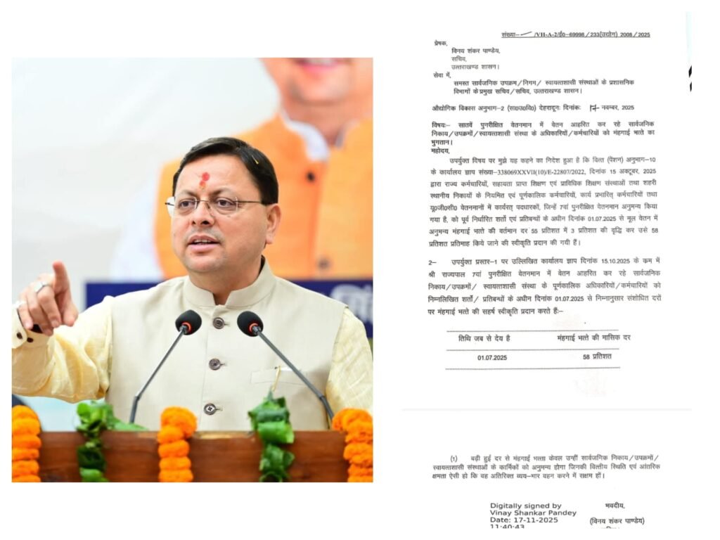देहरादून। मुख्यमंत्री पुष्कर सिंह धामी के नेतृत्व में राज्य सरकार ने कर्मचारियों को बड़ी राहत देते हुए महंगाई भत्ते (DA) में 3 प्रतिशत की वृद्धि को मंजूरी दे दी है। धामी सरकार लगातार कर्मचारियों के हितों के प्रति गंभीर रही है, और उसी क्रम में सातवें पुनरीक्षित वेतनमान में वेतन आहरित कर रहे सार्वजनिक निकायों, उपक्रमों व स्वायत्तशासी संस्थाओं के अधिकारियों–कर्मचारियों के लिए DA को 55% से बढ़ाकर 58% किए जाने का निर्णय लिया गया है। नई दरें 1 जुलाई 2025 से लागू होंगी।