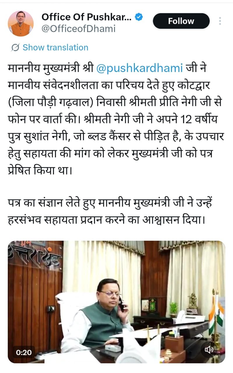 मुख्यमंत्री श्री पुष्कर सिंह धामी ने एक बार फिर अपनी मानवीय संवेदनशीलता और जनसेवा के प्रति प्रतिबद्धता का परिचय दिया। मुख्यमंत्री जी ने कोटद्वार (जिला पौड़ी गढ़वाल) निवासी श्रीमती प्रीति नेगी से दूरभाष पर वार्ता कर उनके 12 वर्षीय पुत्र सुशांत नेगी के स्वास्थ्य की जानकारी प्राप्त की।