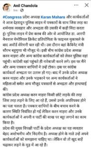 वरिष्ठ पत्रकार अनिल चंदोला ने कहा. कि उनकी फेसबुक कलम से… #Congress प्रदेश अध्यक्ष Karan Mahara और कार्यकर्ताओं ने आज देहरादून पुलिस लाइन में पत्रकारों के साथ जिस तरह का शर्मनाक व्यवहार और अभद्रता की उसकी में कड़ी निंदा करता हूं। पुलिस लाइन में प्रेस क्लब की ओर से आयोजित डा. आरपी नैनवाल मेमोरियल क्रिकेट प्रतियोगिता के फाइनल मुकाबले के बाद अवॉर्ड सेरेमनी चल रही थी। उस दौरान वहां कैबिनेट मंत्री सौरभ बहुगुणा भी मौजूद थे। इसी बीच कांग्रेस प्रदेश अध्यक्ष करन माहरा और अन्य कांग्रेस कार्यकर्ताओं को लेकर पुलिस वहां पहुंची। कांग्रेसी वहां पहुंचते ही नारेबाजी करने लगे। इस पर मैंने और अन्य पत्रकार साथियों ने उन्हें टोका। इस पर कांग्रेस कार्यकर्ता अभद्रता पर उतारू हो गए। बाद में उनके प्रदेश अध्यक्ष करन माहरा और उनके भड़काने पर अन्य कार्यकर्ताओं ने महिलाओं समेत अन्य मौजूद पत्रकारों से अभद्रता और हाथापाई की।
