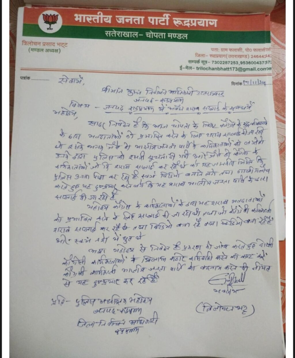 दुष्प्रचार के सहारे कांग्रेस फिर कुछ कारनामा करने की सोच रही है, लेकिन झूठ को सौ बार भी बोला जाए तो वह सच नही हो सकता। चोपता बाजार मे शराब् की जो गाड़ी पकड़ी गयी वह किसकी है? ड्राइवर तो कांग्रेसी होने की सूचना है। हमारे भाजपा मंडल अध्यक्ष ने तत्काल मुख्य निर्वाचन अधिकारी को पत्र लिखकर मामले की जांच की मांग की है। कांग्रेस तो शराब से भाजपा का नाम जोड़कर चुनाव को प्रभावित करने का हत्थकंडा अपना रही है, लेकिन जनता का क्या करेगी। उसे सब पता है।